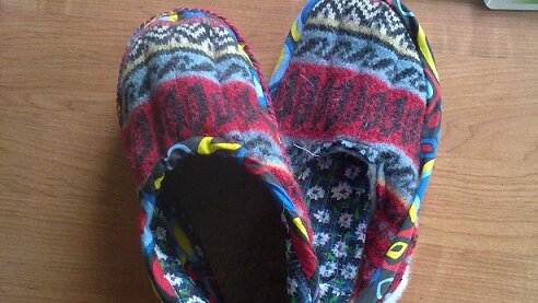 Нашла в интернете довольно простой способ сделать выкройку домашних тапочек и сшить их. Попробовала сшить, но пока сшила только один, в основном чтобы показать как шить. Второй закончу позже. Я в первый раз шью тапочки, поэтому не все у меня гладко получилось, но сам принцип шитья расскажу. Чтобы сделать выкройку, надо сделать болванку, для этого могут пригодиться пластиковые или резиновые тапочки. У меня нашлись не тапочки а шлепанцы, но тоже подойдут. Набиваю шлепанцы ветошью. И натягиваю...