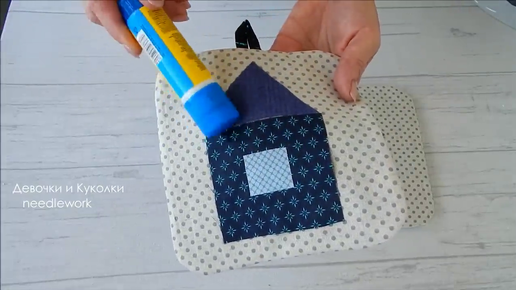 1. Подготовить четыре квадрата цветной светлой ткани размер 18*18 см утеплитель любой, у меня холстопрошивное полотно. Вырезать детали домиков. 2. В двух квадратах ножницами сделать отверствие в середине ( дырку) 3. Заранее подготовить петельку 4. Утеплитель один на другой и прошить, если заметили в середине меньше 5...