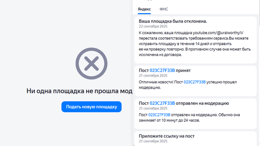 Эксперимент с рекламной сетью Яндекса для блогеров (РСЯ для блогеров) на youtube-канале Достойный IV закончился ожидаемым результатом "РСЯ для блогеров" была подключена на ютуб-канал в начале сентября 2025 года. Замечу, что модераторами "РСЯ для блогеров" мой канал на рутубе был отклонён :) сразу, видимо, по причине малого количества подписчиков 17 000. Схема работы с "РСЯ для блогеров" довольно проста - система генерирует рекламные посты, которые размещаются на канале, ссылка на рекламный пост...
