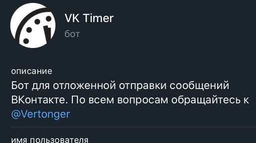 Иногда бывают ситуации, когда необходимо отправить сообщение не сейчас, а через некоторый промежуток времени. Например, поздравить кого-то с праздником или просто напомнить о чем-то важном. В mail.ru такой функционал есть уже давно, в Telegram его недавно добавили, а во ВКонтакте его всё ещё нет На помощь приходит Telegram-бот @VK_timer_bot Авторизация очень простая и занимает меньше минуты При создании отложенного сообщения адресата можно выбрать из списка своих диалогов или друзей...