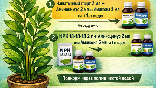 Расшифровка по карточке — стимулируем рост листьев замиокулькаса 🌱 Стандартная схема подкормок на рост зелени: 1️⃣ Удобрение: