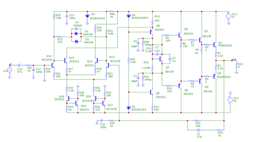 Рассматривается модель относительно простого УМЗЧ для дома. Выходная мощность 50Вт на нагрузке 4 Ом. УМЗЧ рассчитан на питание от трансформаторов распространенных советских УНЧ Кумир, Амфитон и др., у которых напряжение после выпрямителя при отсутствии сигнала составляет 28 - 35 В. Схема работоспособна при снижении напряжения питания до 22 В. Если напряжения питания не входят в этот интервал, требуется изменение сопротивлений некоторых резисторов. Установка тока покоя осуществляется подбором сопротивления...
