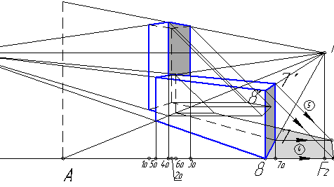 Для построения перспективной проекции (перспективы) необходимо иметь чертеж плана и главного фасада здания. На фасаде (фронтальной проекции) указывают линию горизонта h, на плане проводят линию картины k через один из углов условного здания, угол наклона выбирают произвольно в пределах от 25° до 45°. Точка зрения S выбирается таким образом, чтобы точки фокусов f1 и f2 проецировались на ось х справа и слева от проекции фасада, так, как показано на рисунке 1. На плане обозначают цифрами углы условных зданий На рисунке 1 обозначены цифрами от 1 до 8)...