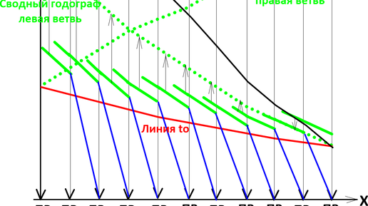 Сводные годографы строятся для дальнейшей интерпретации путем переноса по вертикали нагоняющих годографов одноименных преломленных волн, зарегистрированных с разных пунктов возбуждения, таким образом, чтобы они составляли продолжение друг друга. Построение сводных годографов производится по годографам, ветви которых направлены в одну и другую стороны (Рис.5-1). Соответствующий алгоритм реализации этой процедуры, предусматривающий статистический учет случайных погрешностей в значениях времени, прост и сводится к следующему...