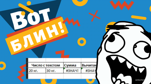 Если ячейка содержит число и текст, то сразу встает вопрос: как произвести вычисление с такой ячейкой, например, суммирование? На многих эксел форумах всё сводится к конструированию довольно сложных формул для решения этой проблемы. Хотя, на самом деле, excel имеет замечательный инструмент, позволяющий сильно упростить нашу задачу - вычитать, умножать, делить и суммировать, если ячейка содержит определенный текст и число (те же: кг.; руб.; метры и т.д.). Как видно из скриншота, эксел не может произвести вычисления с ячейками, содержащими определенный текст и цифры...