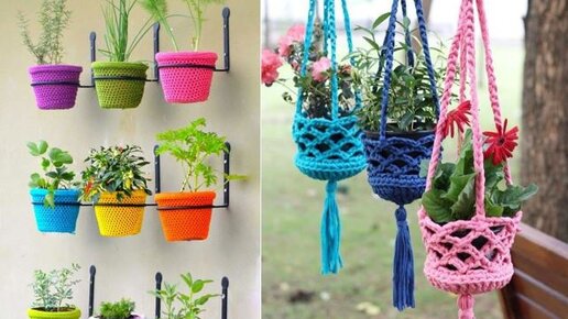 Вязаные кашпо для цветов.Подборка идей и хорошего настроения.