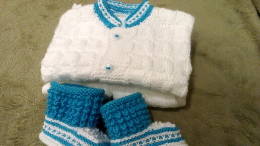 Возраст: от 0 до 3 месяцев Узоры: платочная вязка, лицевая гладь, «плетенка», «двухцветные крестики» Пряжа: детская новинка белая и голубая. Ход работы: Жакет: Вяжем полочки и спинку единым полотном. Набрать голубой пряжей на круговые спицы 110 петель связать платочной вязкой 6 рядов, 12 рядов узором «Двухцветные крестики», 12 см – узором «плетенка», при этом справа и слева полотна по 8 петель вяжем платочной вязкой – это планка + 2 кромочные. На одной из планок сделаем 4 отверстия для пуговиц – накид, 2 петли вместе...