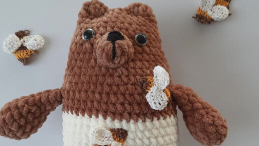 Медвежонок, который очень любит мед. Мягкая игрушка связанная крючком из плюшевой пряжи для детей от 6 мес до 6 лет для игры, обнимашек и сна в обнимку с мишкой. Медвежонок связан по спирали без петель подъема в начале каждого ряда. Пришивных деталей почти нет, исключение - носик и пчелки. Лапки и ушки вывязываются в процессе вязания. Размер готовой игрушки - около 25 см. Инструменты и материалы Условные обозначения Порядок работы Ножки Нить обрезать, закрепить. Свяжите 2 детали Ручки 3-5 ряд - 12 сбн (3 ряда) 6...