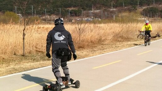 Посмотрите только на этого негодяя. Едет на крутой электро-доске с большими колесами. Скорость у него километров 40 в час, наверное, огромная батарея, надолго хватит. И ногами не надо толкаться вообще. Завидую по-черному.
