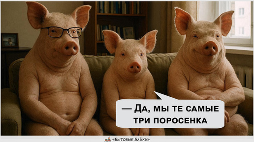 Как Три поросёнка делят трёшку Звонок в дверь обычной трёхкомнатной квартиры в спальном районе. Открывают трое... хм, как бы это помягче... существ свиноподобной наружности, но в домашних тапочках. Я долго не решался на эту встречу — всё-таки говорящие поросята в панельной девятиэтажке звучат абсурдно даже для моей практики. Но любопытство взяло верх: как легендарные братья живут в наше время? 🏠 Три брата — один адрес Ростинмир Шутилин: Добрый день! Простите, я немного... э-э... Вас действительно трое, да? И вы те самые...