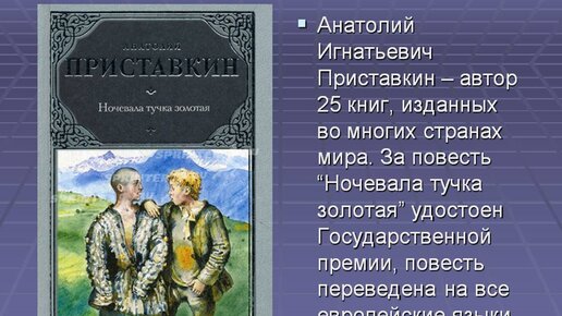 Сегодня поделюсь с вами впечатлениями от прочтения книги Анатолия Приставкина «Ночевала тучка золотая» - самой пронзительной и искренней, на мой взгляд, повести 20-го столетия. Можно назвать ещё несколько произведений русской литературы, которые по силе воздействия равны этой повести: «Уроки французского», «Ташкент город хлебный», «А зори здесь тихие». Но можно ли сидя в тёплой квартире понять или даже представить все ужасы, которые описаны в этих произведениях? Ночевала тучка золотая На груди утёса – великана…» - строчки из стихотворения М...