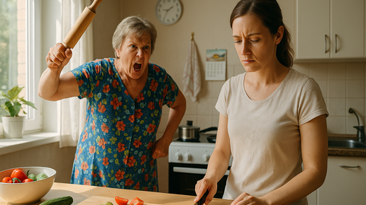 Когда я готовила ужин, свекровь оттолкнула меня скалкой по голове рявкнув: — Кто так режет, криворукая!