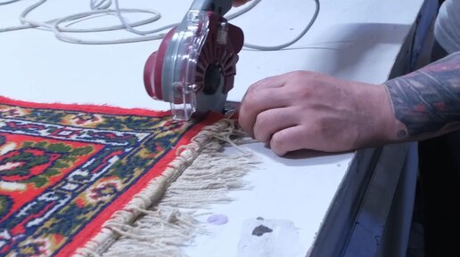 Отрезаем старую бахрому от ковра.