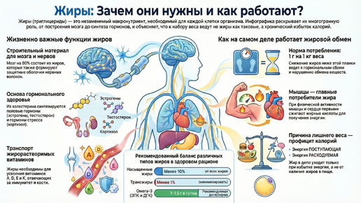 Сегодня мы погрузимся в одну из самых противоречивых тем в диетологии — жиры. Многие из нас привыкли думать о жирах как о главном враге стройной фигуры, но так ли это на самом деле? Сегодня я разберу два глобальных мифа, которые мешают вам построить здоровый рацион и красивое тело. Миф первый: Жиры — это просто калории и лишняя энергия. Многие считают, что жиры нужны организму только как топливо, и если их сократить до минимума, ничего страшного не случится. Это фатальная ошибка. На самом деле, жиры...