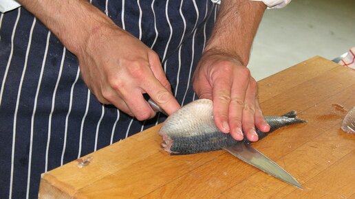 Занимаясь приготовлением селедки, большинство людей не могут нормально удалить все косточки. Кажется, что невозможно убрать все кости или это будет отнимать слишком много времени. Поэтому стоит вспомнить способ, благодаря которому можно будет убрать кости из филе селедки за несколько минут. Что необходимо Изначально нужно подготовить: 1) Разделочную доску. 2) Полиэтиленовый пакет. Он должен быть плотным, одноразовые из магазина не являются хорошим решением. 3) Острый нож – это важно. Процесс разделки селедки на филе без косточек 1) На разделочную доску надевается полиэтиленовый пакет...