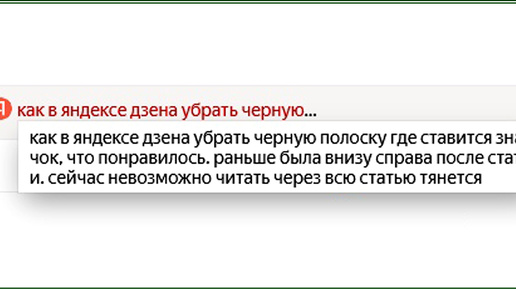 Ну, что я вам говорил? Посыпались поисковые запросы от пользователей, недовольных введением на Дзене черной "липучей" панели в статьях. Кто подскажет пользователю Дзена рецепт как убрать новую чёрную панель-табло-меню с кнопками лайков и комментариев?) Читатель Дзена негодует! Он недоволен! Пользователь пишет в поисковой строке Яндекса, что невозможно читать контент! Мешает новая черная панель. От которой отделаться не так и просто) Так же стали появляться и другие запросы, такие как "Дзен надоел...