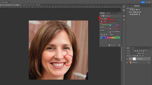 Предположим на фотографии имеется паразитный красный цвет, в данном случае мы будем использовать hue/saturation, в открывшемся окне берем пипетку и наводим на красные щеки Ползунок hue уводим на +180 Ползунок saturation на +100 Крайние маркеры сводим к двум центральным Затем, крайний правый маркер двигаем вправо до тех пор, пока выделение не заполнит лицо Возвращаем hue и saturation, ставим на 0. Показатель lightness перемещаем вправо до тех пор, пока не уйдет краснота с щек Кликаем по нашему слою и инвертируем маску (ctrl + i)...