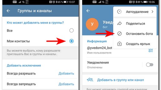 К сожалению спам начинает появляться и в Телеграм. Читатели подсказали, как запретить добавление в спам-группы и как заблокировать спам от "Уведомление бот". В последнее время меня часто стали добавлять в группы и я уже устал нажимать "Выйти и сообщить о спаме". Оказывается в Телегам можно запретить незнакомым людям добавлять вас в группы. Это делается так: в главном окне Телеграм нажимаем три полоски в левом верхнем углу - Настройки - Конфиденциальность - Группы и каналы. Переключаем настройку "Кто может добавлять меня в группы?" с "Все" на "Мои контакты"...