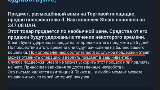 Не так давно к концу летней распродажи в Steam хотел купить себе игру, но денег в кошельке Steam как обычно не хватало. Решил продать что-нибудь ненужное из инвентаря, чтобы получить как можно быстрее деньги на кошелек Steam. Так как конец распродажи близок, решил продать по наибольшей предложенной цене за предмет. К моему удивлению предмет (Нашивка | Entropiq (золотая) | Стокгольм 2021) из моего Steam инвентаря ушел, но деньги на кошелек так и не пришли. Потом увидел, что они мне пришли, но находятся на удержании...