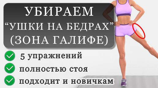 Тренировка от галифе предназначена для женщин, которые хотят обрести красивую и стройную форму ног. Программа состоит из 5-ти эффективных упражнений с жиросжигающим эффектом, которую легко выполнять в домашних условиях. Комплекс будет доступен и новичкам. Вы можете усложнить тренировку, если будете использовать утяжелители для ног. Тренировка для избавления от галифе Представленная тренировка от галифе не только поможет уменьшить ушки на бедрах, но и подтянет внутреннюю часть бедра и ягодицы, ускорит сжигание жира...