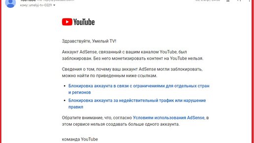 Заблокировали AdSense Ютуба Пришло на почту письмецо от Гугла что мой аккаунт Адсенс заблокирован! Непонятно за что, почему, и как... Итак по полтора доллара в месяц капало от рекламы, а теперь и вовсе никаких прибытков.