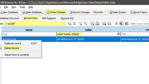 В других браузерах [на основе Chromium] работает выбор записи стрелкой и Shift+Delete. В Edge тоже когда-то работало, но почему-то отключили и не предложили альтернативы. Возможно, не решили вопрос синхронизации... Меня ранее спрашивали о решении в личной переписке, да и сам я интересовался, хотя и поверхностно. А тут реально захотелось удалить пароль, случайно попавший в поле имени пользователя. Покопался и не нашёл ничего лучше, чем прямая правка базы данных - файла Web Data в профиле браузера...