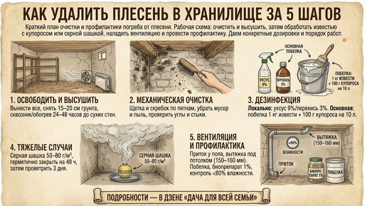 Если коротко, как удалить плесень в хранилище эффективно: сначала полностью высушить и механически очистить поверхности, затем обработать их известково-купоросной побелкой или, при сильном заражении, серной шашкой, и обязательно наладить приточно-вытяжную вентиляцию с контрольной влажностью не выше 80%. Для профилактики держим стены светлой известковой побелкой с антисептиком, ящики и урожай проливаем биопрепаратом, а осенью делаем повторную обработку за 2-3 месяца до закладки. Без устранения сырости борьба с плесенью превращается в бесконечную «перекраску»...