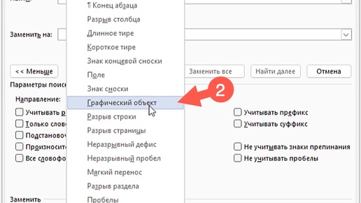 Вполне может возникнуть ситуация, когда потребуется удалить все изображения, которые были вставлены в текстовый документ. Выделять и удалять каждое изображение вручную крайне утомительно, ведь в документе их может быть очень много. Воспользуемся специальным кодом для поиска изображений. Для этого откроем окно Найти и заменить. Сделать это можно через вкладку Главная или воспользовавшись сочетанием клавиш Ctrl+H. Устанавливаем текстовый курсор в поле Найти и нажимаем на кнопку Больше. Далее в выпадающем списке Специальный выбираем Графический объект...