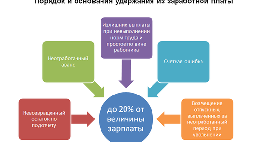 Удержания по инициативе работодателя Удержание из зарплаты делают только по ТК РФ и другим законам. Нельзя прописать свои вычеты из зарплаты в трудовом договоре, локальном нормативном акте работодателя. Основания удержания из зарплаты по инициативе работодателя: Пропорцию между авансом и остатком заработной платы работодатель определяет сам. Например, он установил аванс на уровне 75% от зарплаты и оплатил его заранее, а работник фактически его не отработал. Допустим, работника отправили в командировку и выдали деньги авансом на возмещение расходов...