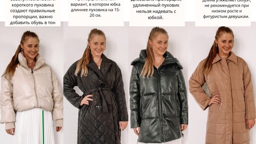 🤔А что насчёт длины? Давайте немного разберём , какую длину пуховика лучше всего выбрать? 🌟Короткий пуховик - для любого роста, удлиняет ноги, может перегрузить верхнюю зону, не рекомендуется грушам или полному яблоку. 🌟Удлинённый пуховик - только для высокого роста и длинных ног. Такая длина пуховика позволяет надевать только брюки, с юбками такая длина не пропорциональна. 🌟Пуховик до колена или чуть ниже колена- хорошая длина для невысокого роста, будет пропорциональна для брюк и юбок, сохранит пропорции...
