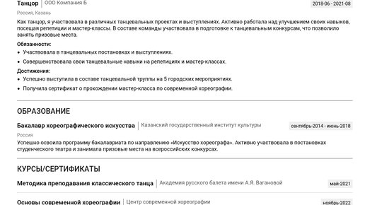 Чтобы создать действительно сильное резюме танцора, изучите готовый пример, который поможет понять требования и стандарты индустрии. Эффективное резюме – ваш ключ к получению желанной работы в танцевальной сфере. 🩰 На этой странице вы найдете полное руководство по тому, как составить эффективное резюме танцора для любого уровня – от начинающего до опытного профессионала. Мы разберем каждый блок пошагово, чтобы вы учли все важные моменты: Изучив пример, вы сможете создать резюме с помощью нашего конструктора резюме...