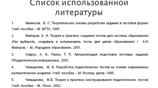 В реферате список использованной литературы представляет собой перечень всех источников, которые были использованы в работе, включая книги, статьи журналов, интернет-ресурсы и другие. Он размещается после основного текста и указывает на то, что проведенное исследование основано на точной и достоверной информации. Корректное оформление списка литературы значительно повышает научную ценность работы и упрощает поиск первоисточников. В списке использованной литературы в реферате необходимо указать информацию обо всех использованных при написании источниках...