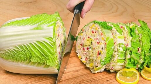 Этот рецепт не столько про набор ингредиентов, сколько идея удобного хранения и красивой подачи разных салатов из коллекций хозяек. Главная идея этой закуски в том, что любая салатная начинка заворачивается слоями с листами пекинской капусты. Вы можете подать к столу в таком исполнении два-три салата. К примеру: рыбный, мясной и овощной. Или просто заверните в листья пекинской капусты или салата «айсберг» готовую острую корейскую морковь...