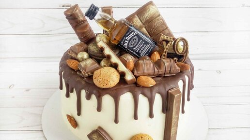 Подобрать дизайн тортика детям или женщине - проще простого, а вы попробуйте угодить мужчине! Сколько раз сама садилась на поиски очередной порции вдохновения, когда требовалось приготовить десерт для сильного пола. Я своих родных чаще балую юморными изделиями (их покажу в конце статьи), а пока начнем с классики. Это торт а-ля куча сладостей с бутылочкой горячительного. От такого тортика мало кто откажется, согласитесь)) Поэтому такой вариант сейчас в топе. Для джентельменов без лишней мишуры. Хотя мастику любят не все...