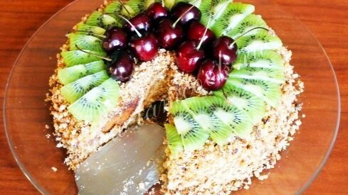 Ингредиенты: • пряники 0,5кг (лучше шоколадные) • сметана 200мл • бананы 2шт. • киви 1шт. • вишня/черешня 1ст. Приготовление: Достаточно пакета пряников, сметаны и любых фруктов. Для приготовления крема натрите бананы и перемешайте их со сметаной. Сахар не добавляйте, т.к. сахарная глазурь, которой покрыты пряники, попадет в этот крем. Пряники нарежьте на тонкие кусочки. Пару пряников отложите для оформления торта. Обмакивайте кусочки пряников в крем и собирайте торт. Торт можно собрать сразу...