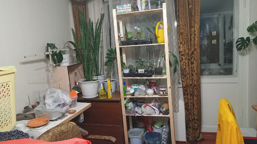 04.01.2024 Началось все с первого инвалидика. Я про него уже рассказывала и показывала. Прошла неделя, а стеллаж стоит, скотч его держит. Пользуюсь им. Следующий этап - стеллаж высотой 1,9 метра. Распилила досочки, постепенно сколачивала полки. Сноровка появляется. Технология вырабатывается. Гвозди начинают ровнее вколачиваться. Хи-хи... ну по сравнению с первым - ясно видно что ровнее. И разваливаться полочки не очень-то спешили, но гвозди все равно вылазили... Пять полок собрано. И монстрище готов...