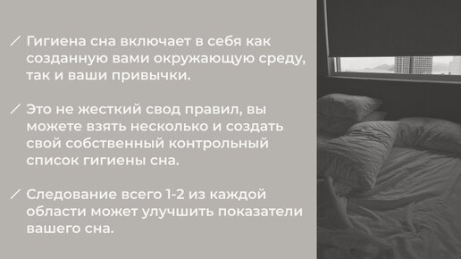 Наиболее показательные признаки плохой гигиены сна: Область 1. Установите свой график сна. Область 2. Вечерняя рутина Область 3. Дневные привычки для поддержания циркадного ритма. Область 4. Оптимизируйте свою спальню Итак, основная концепция гигиены сна - что ваша среда и привычки могут быть оптимизированы для лучшего сна, но то, как выглядит идеальная гигиена сна, индивидуально...