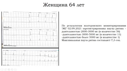 Женщина 64 лет жаловалась на отключения сознания и падения, когда она находилась в положении стоя. Выполнили суточное мониторирование и обнаружили эпизоды брадикардии (замедленного ритма сердца) с ЧСС до 22 в минуту, а также несколько десятков пауз, самая длительная из которых - 7 секунд. Ключевой момент заключался в том, что все паузы возникали ночью. Разумеется, было огромное искушение связать эти паузы с эпизодами отключения сознания: "видимо, потому сознание иногда и отключается, что возникают такие вот паузы не только ночью, но и в дневное время"...