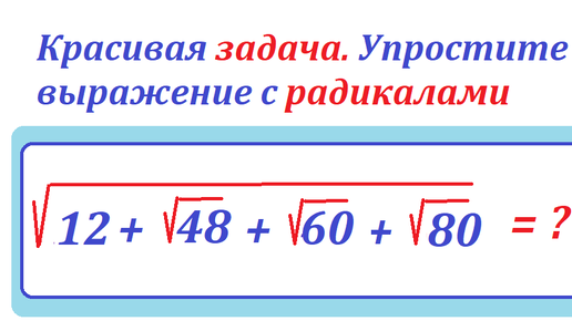 Приветствую читателей и подписчиков канала Тесты_математика! Решим задачу на упрощение выражений с радикалами. Задача. Упростите выражение с радикалами: √(12 + √48 + √60 + √80). Методом решения подобных задач является выделение под внешним радикалом полного квдрата выражения. √(12 + √48 + √60 + √80) = √(12 + √4 * 12 + √4 * 15 + √4 * 20) = √[12 + √(4 * 3 * 4) + √(4 * 3 * 5) + √(4 * 4 * 5)] = √[12 + + 2√3 * √4 + 2√3 * √5 + 2√4 * √5]. Под первым радикалом в квадратных скобках находится сумма чисел, в том числе удвоенное произведение чисел √3, √4, √5...