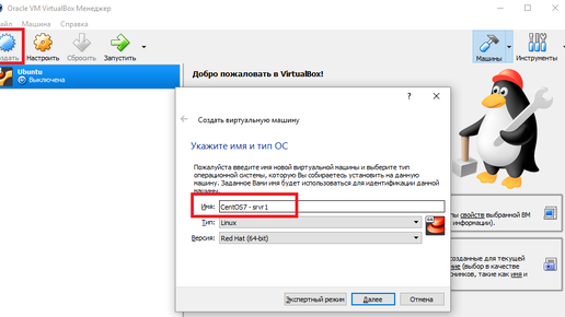5. Указываем тип VDI 6. Указываем Динамический виртуальный жесткий диск 7. Указываем Наименование файла для сохранения жесткого диска, место сохранения на компьютере и размер (мне достаточно 10Gb) 8. После создание виртуальной машины производим настройку: выбираем из меню Настроить;