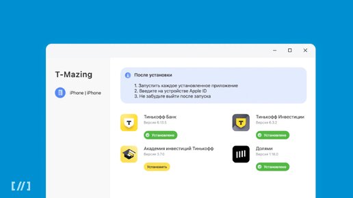 Больше новостей об IT в Telegram канале «Код Дурова» Тинькофф банк опубликовал инструкцию по установке своих приложений на iPhone. Для этого потребуется компьютер на macOS или Windows. Установка при помощи компьютера на macOS 1. Для начала нужно скачать установщик T-Mazing по ссылкам: для Mac с процессорами Intel или для Mac с процессорами M1 и выше. 2. Далее следует кликнуть по скачанному файлу .dmg несколько раз и в открытом окне один раз кликнуть на иконку T-Mazing, удерживая клавишу Control. После этого в появившемся меню нужно выбрать «Открыть»...