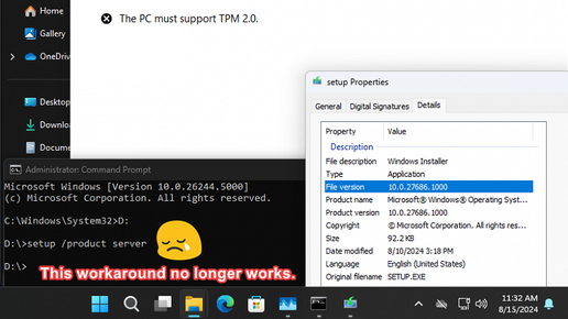 С недавними обновлениями, установка Windows 11 на ПК с устаревшими процессорами становится всё более проблематичной. Microsoft закрывает лазейки, которые ранее позволяли обходить строгие системные требования, особенно в отношении модуля TPM. С выходом сборки Windows 11 Insider Build 27686 (Dilithium) была устранена возможность использования команды «setup.exe/product server», что позволяло инсталлировать ОС на не поддерживаемые процессоры...