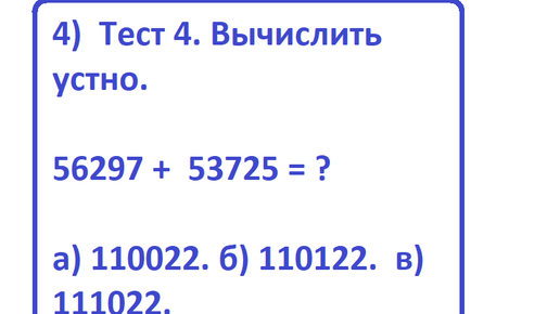 Приветствую читателей и подписчиков канала Тесты_математика! Предлагаю немного размяться, и без калькулятора найти эти суммы чисел. Способов устного вычисления может быть несколько. Как и тренировать устное вычисление, быстро схватывая разряды каждого слагаемого. Так и есть логический способ, который позволяет выбрать из нескольких результатов один правильный. Сначала предлагается условие самих примеров на вычисление, а затем можно проверить свой ответ в тесте, пройдя который, можно сверить свой ответ с эталонным...