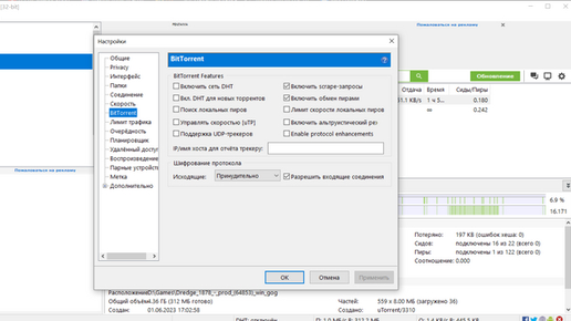 Во вкладке BitTorrent выпиливаем все галочки, кроме двух; Исходящие -> Принудительно. Во вкладке Скорость поставить галочку Применить ограничения к служебному трафику; максимум соединений и присоединенных пиров на торрент поменять на 1000. Перезагружаем роутер/модем (или устройство, которое им прикидывается)...