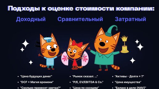 🪙 Как узнать, сколько стоит компания? Ломаем голову (и калькуляторы) вместе! Привет, инвесторы! 👋 Сегодня говорим про три главных подхода к оценке стоимости бизнеса. ❓ Почему это важно? Представьте, что вы покупаете не просто акции, а кусочек бизнеса. Сколько он реально стоит? Переплатите – будете плакать в подушку. Недоплатите – упустите золотую жилу. ✔️ Вот тут и спасают проверенные методы: 1. Доходный подход: Глядим в будущее! 💵➡️🔮 • Суть: Стоимость компании – это нынешняя стоимость всех ее будущих денежных потоков (прибыли, дивиденды)...