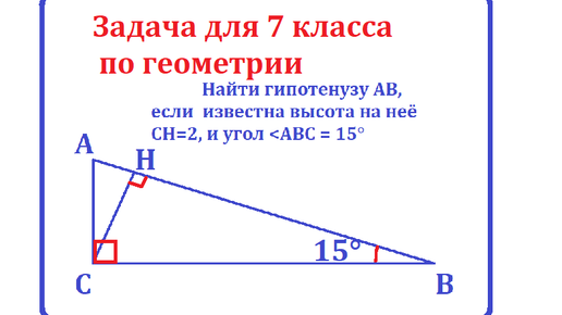 Рассмотрим решение задачи по геометрии, применяя знания для 7 класса, то есть без применения синусов и тригонометрических функций. Задача. Найти гипотенузу АВ, если известна высота на неё, СН = 2, и угол <АВС = 15°. Решение начну с дополнительного построения. Решение можно посмотреть в галерее и видео...