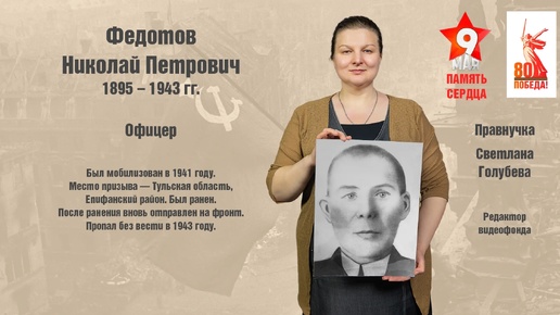 В честь 80-летия Победы MIR24.TV продолжает рассказ о героях Великой Отечественной войны в рамках проекта «Наша память сердца», посвященного фронтовым подвигам родных и близких сотрудников Межгосударственной телерадиокомпании «Мир». Николай Петрович Федотов ушел в первый год Великой Отечественной войны — в 1941 году. Уроженец Москвы призывался на передовую из Тульской области. Как рассказывает редактор видеофонда МТРК «Мир» Светлана Голубева, о боевом пути ее прадеда семье известно очень мало, поскольку в 1943 году красноармеец Николай Федотов пропал без вести...