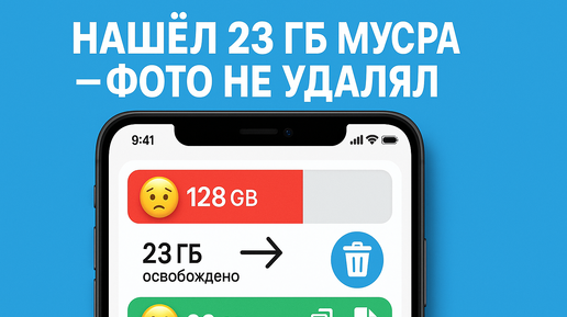 Вчера утром хотел сфотографировать кота. Нажал на камеру — вылезло уведомление: "Недостаточно памяти". Зашёл в настройки. Смотрю: из 128 ГБ свободно только 500 МБ. Занято: Фото и видео: 45 ГБ Приложения: 38 ГБ "Другое": 44 ГБ Что за "Другое" на 44 гигабайта?! Это почти треть памяти! Жена сказала: "Удали старые фото". Но мне их жалко — там воспоминания. Я решил разобраться, что это за "Другое". Потратил 2 часа, нашёл папки с мусором — освободил 23 ГБ. Фото не трогал. Приложения не удалял. Просто почистил скрытый мусор...