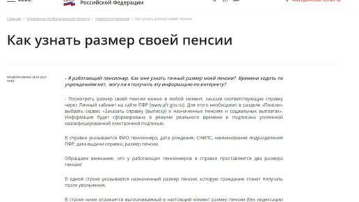 Размер своей пенсии можно узнать в любой момент, заказав соответствующую справку через Личный кабинет на сайте ПФР. Для того, чтобы узнать размер пенсии, не нужно лично обращаться в клиентские службы Пенсионного фонда, предварительно записываясь на прием к специалисту. Информация о размере пенсии является конфиденциальной и дистанционно не может быть предоставлена без подтверждения личности гражданина. Самый быстрый и простой способ получить сведения о размере пенсии - заказать справку через личный кабинет на сайте ПФР...