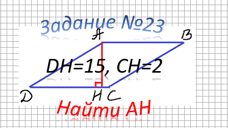 Здравствуйте, уважаемые читатели. В этой статье продолжим разбор задач из 23 задания ОГЭ по математике. Задача Высота AH ромба ABCD делит сторону CD на отрезки DH = 15 и CH = 2. Найдите высоту ромба. К задаче построим рисунок и напишем условие Решение 1) Так как ABCD ромб, то все стороны равны...